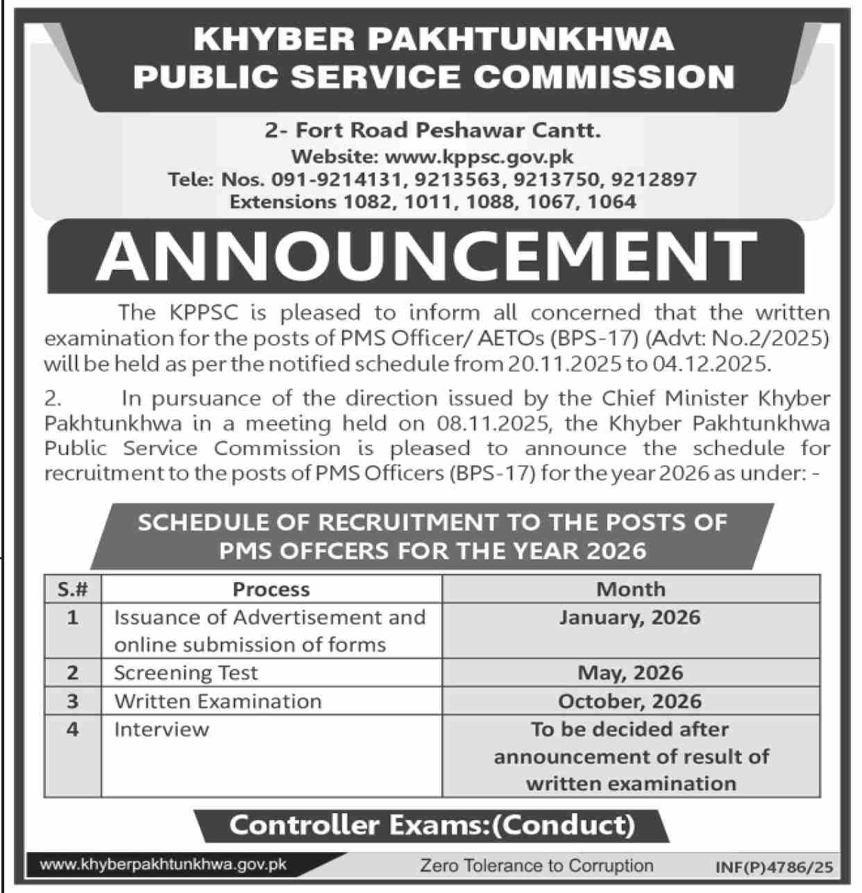 The KPPSC is pleased to inform all concerned that the written examination for the posts of PMS Officer/AETOS (BPS-17) (Advt: No.2/2025) will be held as per the notified schedule from 20.11.2025 to 04.12.2025. In pursuance of the direction issued by the Chief Minister of Khyber Pakhtunkhwa in a meeting held on 08.11.2025, the Khyber Pakhtunkhwa Public Service Commission is pleased to announce the schedule for recruitment to the posts of PMS Officers (BPS-17) for the year 2026 as under.